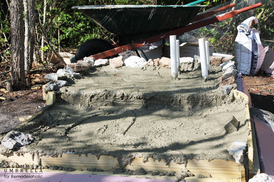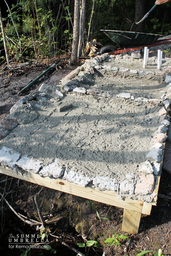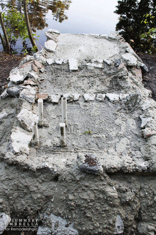 Mix your concrete and apply liberally to all the boxes making sure it fills in all the little gaps and cracks. Also, ensure that it is approximately 1β³ thick in all areas, and then slope it up to the lip with a scrap piece of wood (or your hands, if you dare!). This creates a nice trough for the water to fill in and run out. However, waterfalls aren’t troughs so we added some more of our homemade βrocksβ to break it up. Do this while your concrete is still wet to ensure they adhere.