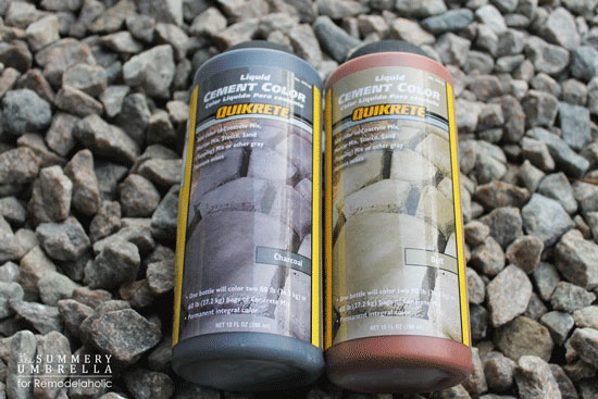 We ended up using three bottles of cement color (each with its own bag of cement), and then an additional two bags of concrete with their usual color without a mold. They were created by just making large square-like sections on the tarp.
