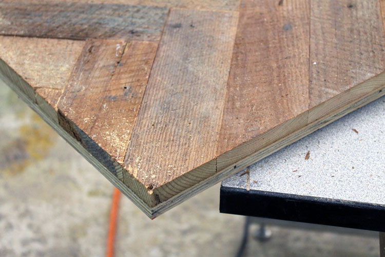 6. Continue this pattern the entire length of your table. As we worked our way down we trimmed the larger lengths off so we could use the scraps to fill the smaller places on the ends. We used a circular saw to do this.