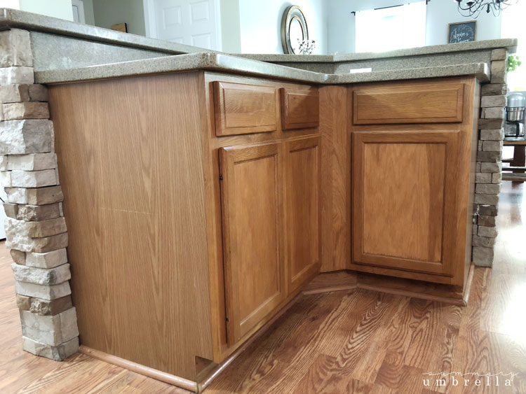 So, the first room that I decided to tackle is the kitchen. I’m just not a faux-wood-grain-kitchen-cabinet-color kind of girl, and they had to go.